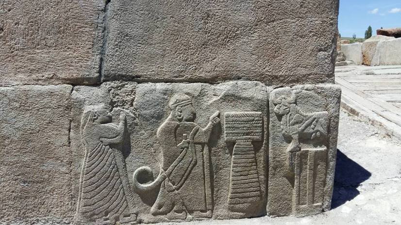 GİRİŞİN SAĞINDAKİ DUVARDA, SANDALYEDE OTURAN GÜNEŞ TANRIÇASI VE KARŞISINDA ELLERİNDE ASA OLAN FİGÜRLER KABARTMASI, GİRİŞİN SOLUNDAKİ DUVARDA DA ALTAR ÜZERİNDEKİ BOĞAYA DUA EDEN KRAL VE KRALİÇE KABARTMALARI VAR.