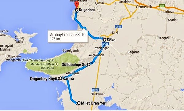 Söke Ovasının batısında, Samson dağının eteğinde güneye doğru yol alırsanız önce Güllübahçe gelir. Buradan güneye devam ettiğinizde, 15.5 km. sonra Samson dağının güney yamacında, Doğanbey köyünü Büyük Menderes deltasına bakarken bulursunuz.