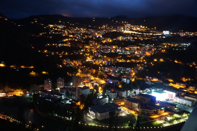 Çoruh nehrinin yatağında oluşan Deriner baraj gölünü takip ederek, Artvin’e ulaştık. Beton kemer olarak yapılan baraj duvarının yüksekliği 249 m., kret genişliği ise 270 m. Bu barajla deli akan Çoruh dizginlendi. Zorluk derecesi itibariyle, baraj inşaatı öncesi, dünyanın sayılı rafting parkurlarından olan Çoruh nehri artık bu özelliğini kaybetti. Baraj 670 MW. kurulu gücü ile yılda 2,1 milyon kwh elektrik enerjisi üretiyor. Baraj gövdesini geçtikten sonra,  bizi ilk karşılayan, Çoruh kenarındaki Artvin Üniversitesi yerleşkesi oldu, modern mimarisiyle ve özellikle kitap şeklindeki kütüphanesiyle. Otelimiz, ırmağın doğu yakasında Seyitler mahallesindeydi. Tam karşımızda Artvin ve gece doyumsuz manzara. Atatepe üzerinde 22 m. yüksekliği ile dünyanın en büyük Atatürk heykeli bulunuyor, 60 ton ağırlığında. ve Dumlupınar’daki haliyle. Işıklandırılması biraz zayıf kalmış. Irmak doğu yakası kent parkı olarak düzenlenmiş. Yayaların karşıya geçebilmesi için iki tane asma köprü var. Irmağın batı tarafında sadece bir kulesi ayakta olan Artvin kalesi görülüyor.