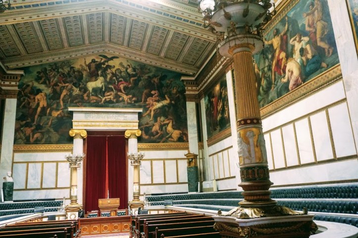 Portaldan, içerideki büyük toplantı salonuna (Assembly Hall) giriliyor. Salonda, oturma sıraları U şeklinde yerleştirilmiş. Oturumu yönetenin kürsüsü, iki aydınlatma direğinin arasında ve tüm salona hakim olacak şekilde bulunuyor. Sıra başları, birer sfenksle kapatılmış. Salonun duvarlarında, Duvarlardaki toplam sekiz tabloda bilgeliğin ve ışığın insanlığa verilmesini betimleyen mitolojik öyküler anlatılıyor. Salona giriş kapılarının iki tarafında iyon düzeninde sütunlar yer almış. Salonun giriş ve çıkış kapılarının yanlarına heykeller ve büstler yerleştirilmiş. Bir heykelin kaidesine şu sözler işlenmiş: Servare İntaminatum. Yasalara, kurallara uy anlamında lekesiz kal, demekmiş. Yaşamımızın merkezinde olması gereken önemli bir tümce.