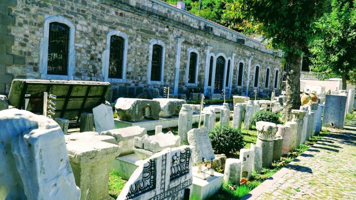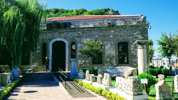 Müzenin bahçesine, sergilenmek üzere; sütun başlık ve kaideleri, frizler, sütunlar, mezar taşları (steller), heykeller, lahitler, osthotek, büyük pithoslar (küpler), amforalar, Osmanlı döneminin demir çapası ile antik dönemin taş çapası, aslan heykelleri yerleştirilmiş.