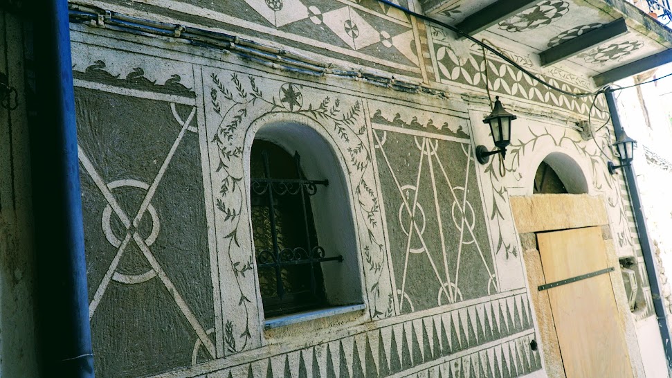 Farklı mimari özellikten söz etmiştim. Bu özellik, bina cephelerinin, özel bir teknikle, çoğunlukla geometrik desenlerle süslü olması. Ksista (Xysta) denilen bu teknikte, bina cepheleri önce siyah, sonra da beyaz sıva ile kapatılıyormuş. Sonra da, çatal ucu ile üstteki beyaz sıva kazınarak, siyah ve beyaz renklerden, çoğunlukla geometrik desenler oluşturuluyormuş. Bugün artık, kazımak için çatal ucu yerine daha modern araçlar kullanılıyormuş. Bu tekniğin bir benzerini de İtalya’da sgrafitto adıyla görmüştüm.