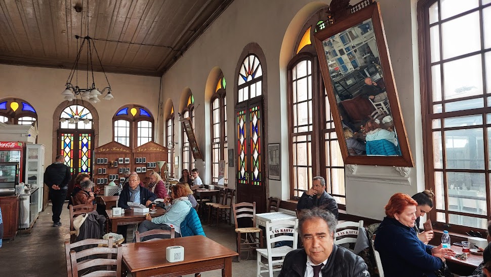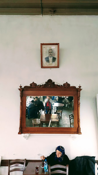 Sol ve sağ taraftaki uzun kenarlarda iki büyük ayna asılı. Sol taraftaki aynanın üzerinde de Taş Kahve’nin ilk sahibi ve işletmecisi dede Hüseyin Beyin fotoğrafı asılı.
