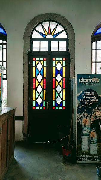 Deniz tarafına ve arka sokağa açılan kapıların pencereleri kırmızı, mavi, sarı ve yeşil camlarla renklendirilmiş.