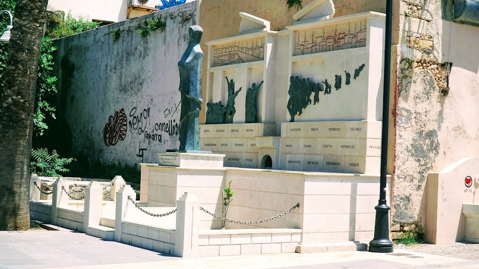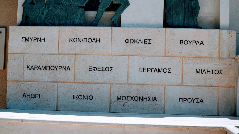 Anıt üzerinde, Yunan alfabesi ile yazılmış Smirni (İzmir), Fokaies (Foça), Voyrla (Urla), Karampoirna, Efesos (Efes), Pergamos (Bergama), Militos (Milet), Litri, İkonio (Konya), Moshonisia (Cunda ve çevre adaları) , Proisa (Bursa), Alatsatı (Alaçatı), Aivali (Ayvalık), Kordelio (Karşıyaka), Tsesmes (Çeşme), Nikaia (İznik), Aidinio (Aydın), Sparti (İsparta), Kirkintzes (Şirince), Sampsointa (Samsun), Magnisia (Manisa), Menemeni (Menemen) ve Sardeis (Sart) isimleri görülüyor. Buralardan, sadece dini inanışları (Ortodoks Hristiyanlar) nedeniyle zorunlu olarak, Girit adasının çeşitli yerlerine gelmişler.