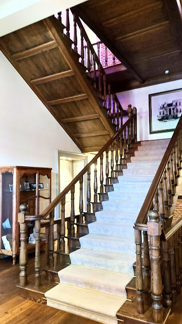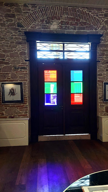 Giriş kapısının tam karşısında bulunan iki kademeli merdivenlerle üst kata çıkılıyor. Ana giriş kapısı ve balkon kapıları mavi, kırmızı, sarı ve yeşil renkli camlarla süslenmiş.