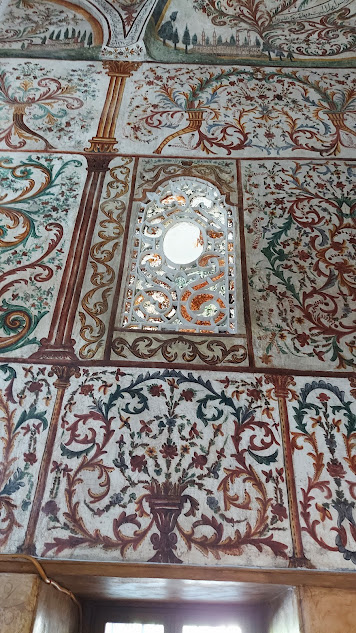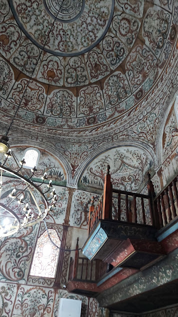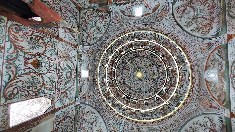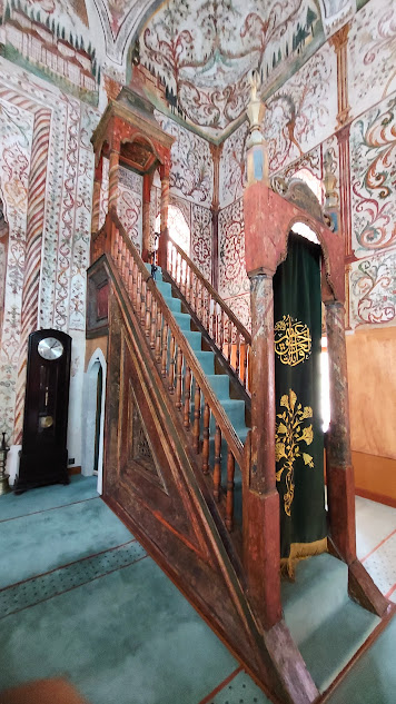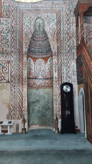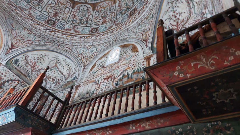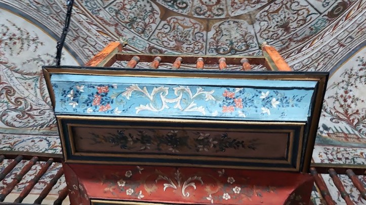 Giriş kapısının üstünde bulunan balkon şeklindeki kadın mahfelinin ahşaptan yapılmış zemin ve alınlıkları da yine kalem işi kırmızı ve beyaz çiçeklerle bezenmiş.