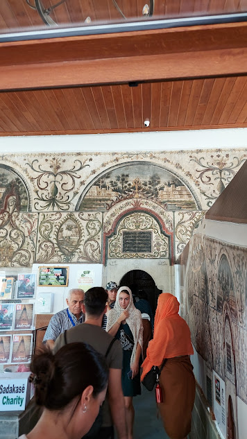 Son cemaat giriş kapısının üzerindeki yarım daire şeklindeki alana ortada ağaçlardan oluşan bahçenin ortasından geçen bir ırmak ve bu alanın ol tarafında çok katlı binalar, arka planda kubbesiz iki minare ve sağ tarafta yine çok katlı binalar resmedilmiş. Revak bölümünün dış yüzeyinde yine buna benzer resimler var.