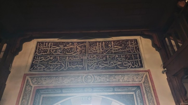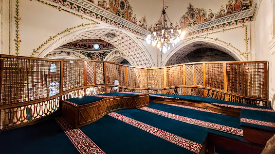 Cami girişinde, cümle kapısı geçildikten sonra ahşap direkler üzerinde, birbirine merdivenli köprüyle bağlı iki bölümden oluşan kadın mahfeli bulunuyor.