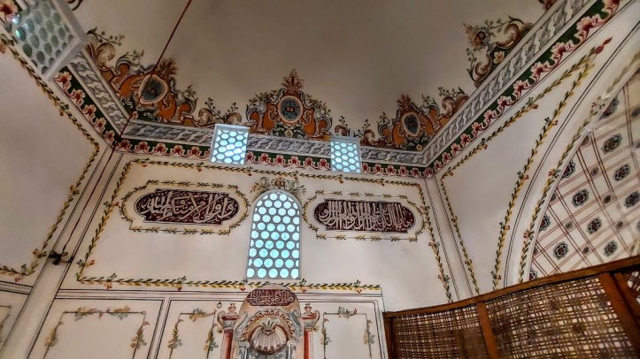 Yan sahınların her birinin üzerinde üç adet silindirik (dikdörtgen) tonoz (kubbe) bulunuyor. Güney duvarındaki mihrap, bir niş şeklinde ve kemerli olup, çevresi ve alnı altın varakla süslenmiş. Mihrabın yarım kubbesi istiridye kabuğu şeklinde dilimlenmiş. Yarım kubbeyi sanki taşıyormuş gibi, mihrabın iç kısmına altı sütun çizilmiş. Mihrabın sağına ve soluna birer tombak yerleştirilmiş.