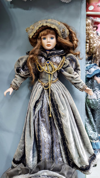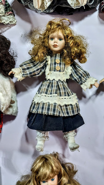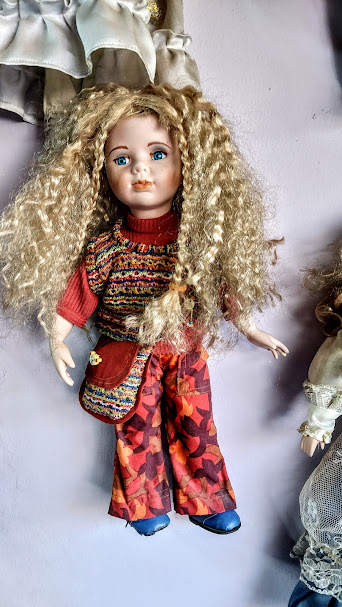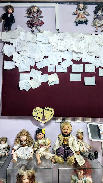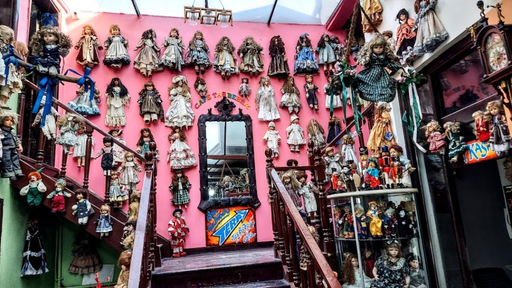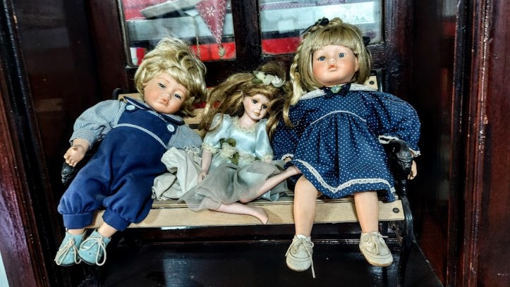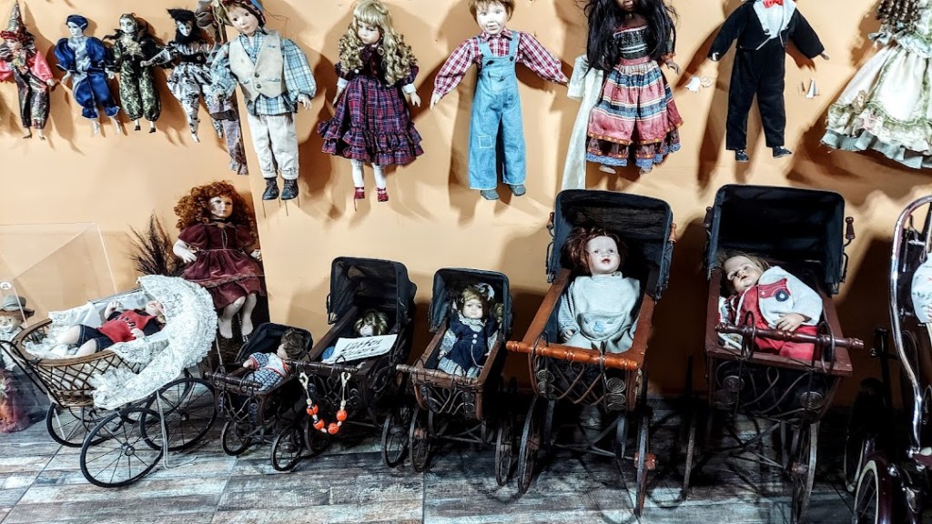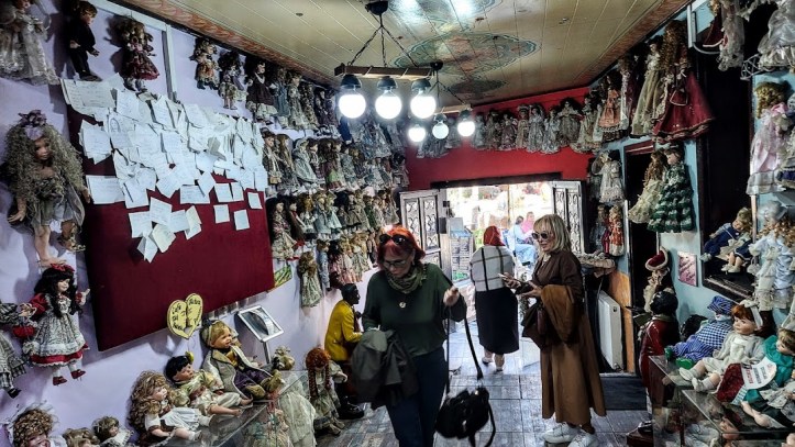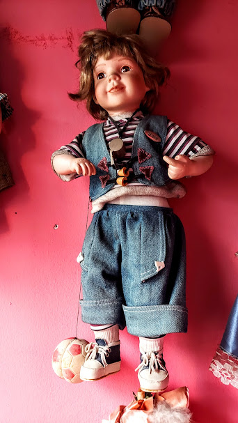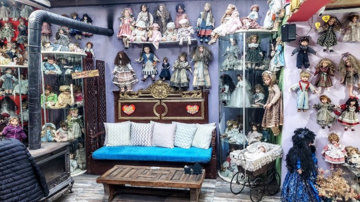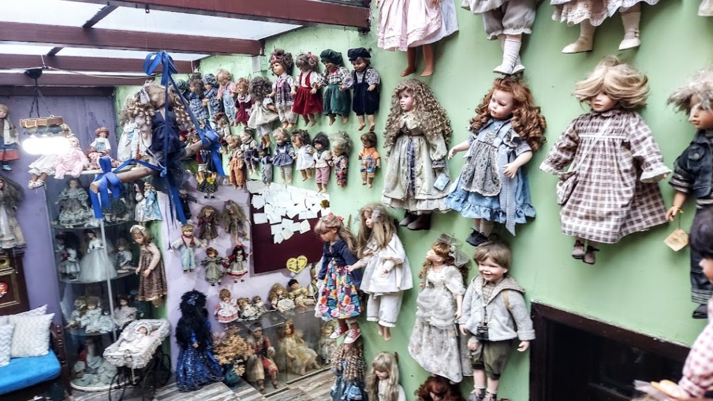 Girişten itibaren bütün duvarlara, ayrıca, vitrinlere ve pusetlere porselen bebekler yerleştirilmiş.