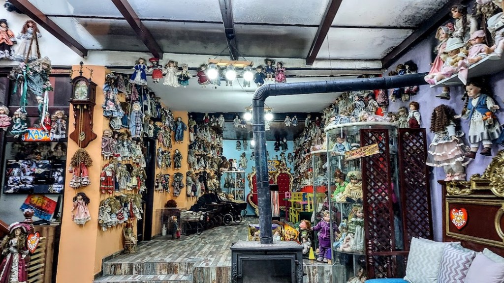Aralarda oturma grupları ve salonun ortasında da bir soba bulunuyor. Merdivenin bulunduğu duvarlar, üst kattaki oda ve teras bölümü bebeklerle dolu.
