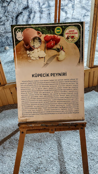 Girdiğimiz eğimli yola, mağaradan çıkmak üzere yöneldiğimde sol tarafta Küpecik Peyniri tabelası ile karşılaştım. Burada tel çitin arkasında, zemine tersine gömülmüş sırlanmış saksı (terra cota) benzeri kaplar gördüm. Sembolik olarak yerleştirilmiş bu kapların benzerleri küçük küplere basılan şirden mayası ile mayalanmış inek sütü telemesinin, üç ay süre ile kuma gömülen küplerde olgunlaşması sağlanarak Küpecik Peyniri elde ediliyormuş.