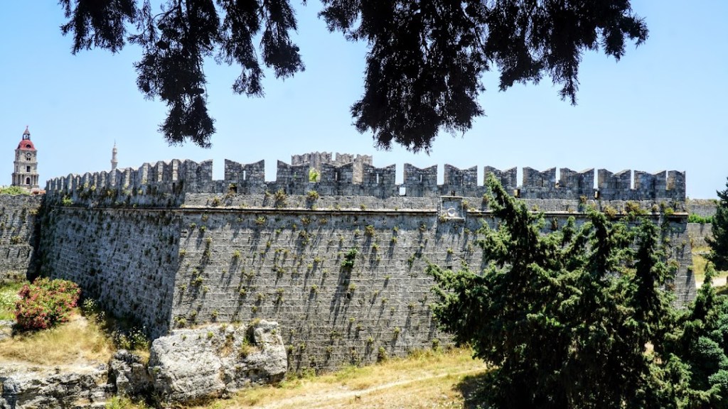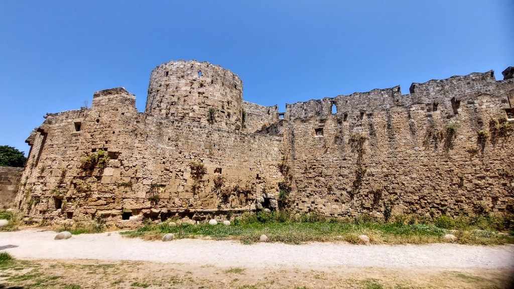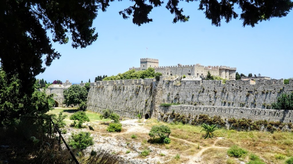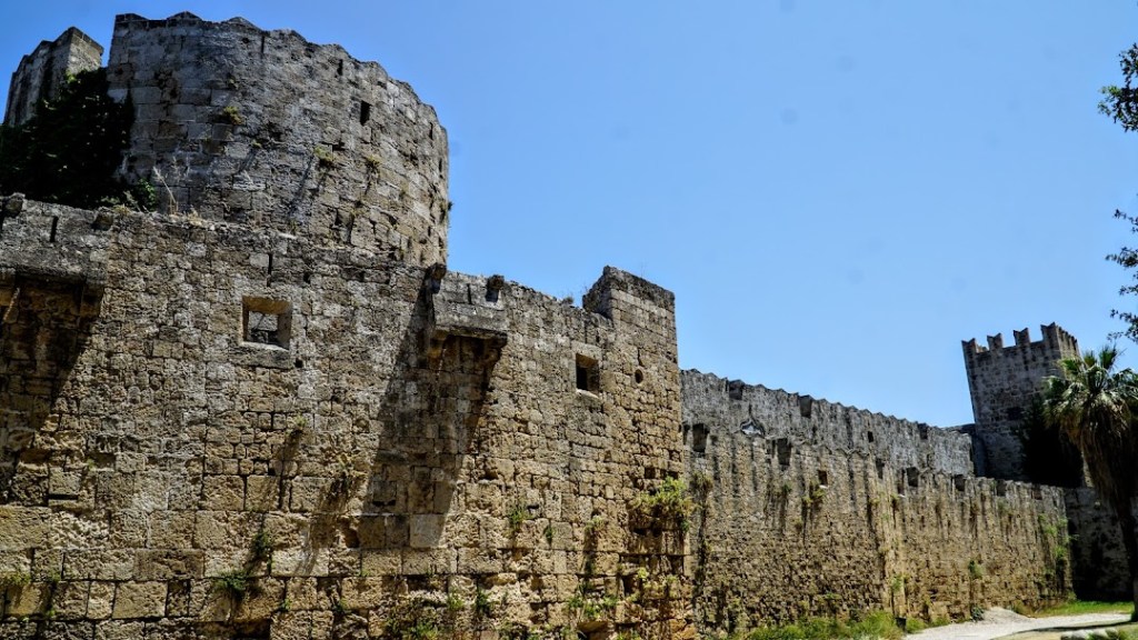 Bizans döneminde 7. yüzyılda bir küçük kale (hisar) inşa edilmiş. 1309 yılında, adayı satın alan Hospitalier Şövalyeleri (Rodos Şövalyeleri) bu küçük kaleyi esas alan bir tahkimatla 14 kapılı büyük bir kale ve kentin kuzey bölgesinde Büyük Üstadları (Grand Master) için bir saray inşa etmişler. Kale surlarının çevresi büyük bir hendekle çevriliymiş. Özellikle batı cephesini çevreleyen hendek 20-25 m. taban genişliğine ulaşıyor. Zamanımızda deniz tarafı girişlerinin kolaylaştırılması nedeniyle hendek eski görünümünde değil.
