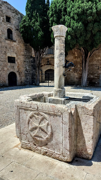 Meydanın ortasında yükseltilmiş bir platform üzerinde mermerden yapılmış küp şeklinde havuzu olan bir çeşme bulunuyor. Musluğu balık şeklinde. Havuzun gövdesine bir daire içine sekiz köşeli haç reliyefleri işlenmiş. Havuza bakan bina, Fransız şövalyelerinin hanı olup, gövdesine şövalyelerinin iki işaretini (haç ve üç yaprak) taşıyan mermer plaka gömülmüş.