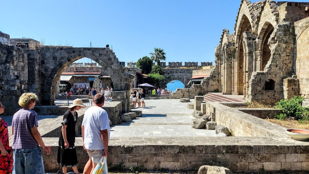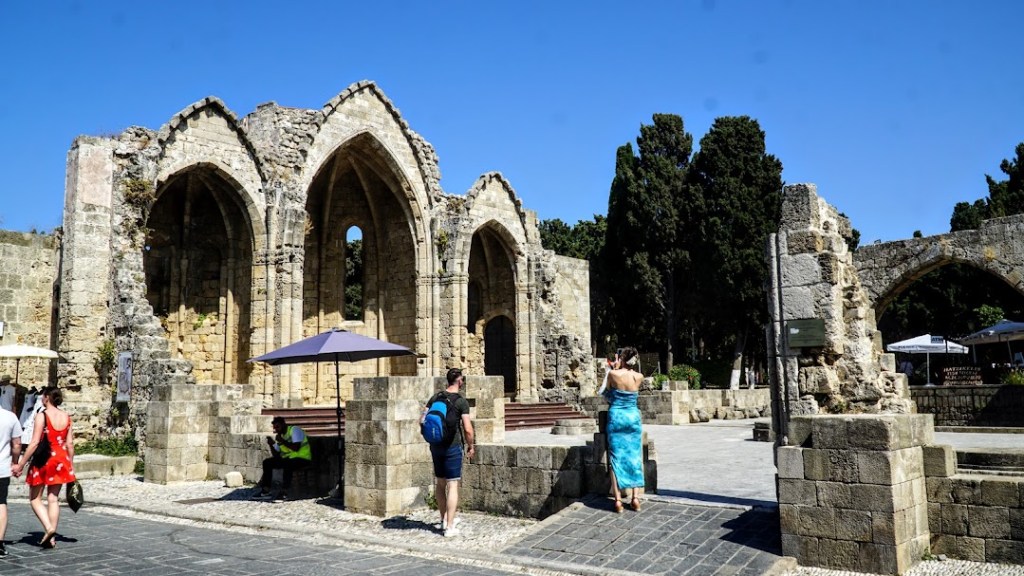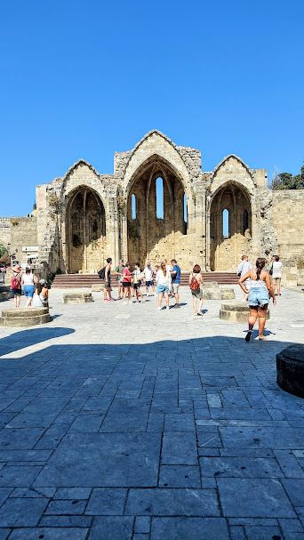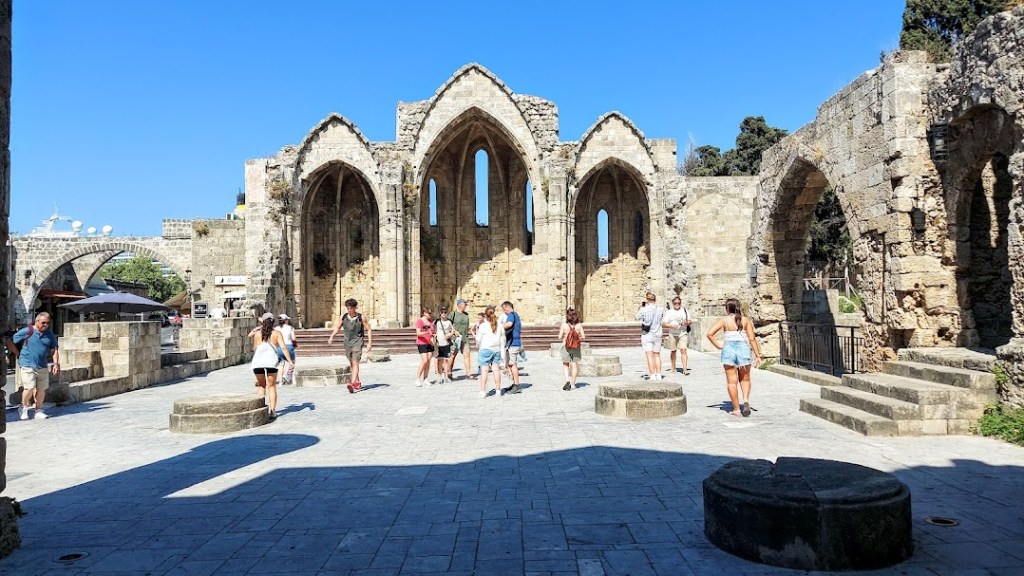 Ficus ağaçları (Manolya da bu ağaç ailesine ait) Rodos kentinin her yerinde. Geniş taçlarıyla insanlara gölgelik alanlar sunuyor. Belki biz de Güney bölgelerimizde dikmeyi düşünmeliyiz. Aristoteles Sokağının sonunda solda Panaghia (Aziz Meryem) Kapısı, sağda da 14. yüzyılda inşa edilen Meryem Ana Kilisesi’nin (Latin Church of Our Lady of Mercy ya da Chuch of Virgin Mary) kalıntıları bulunuyor.