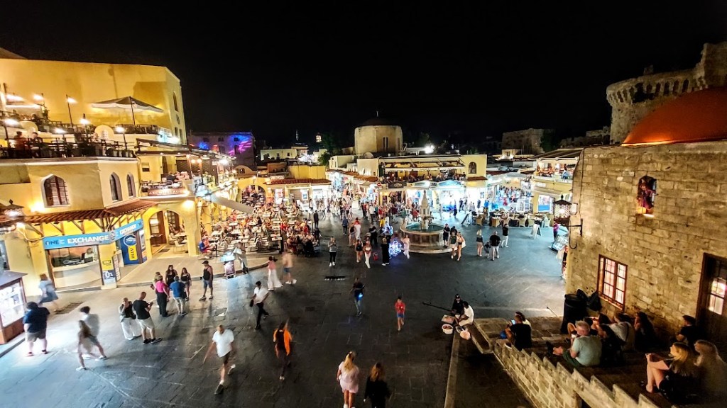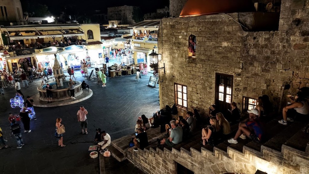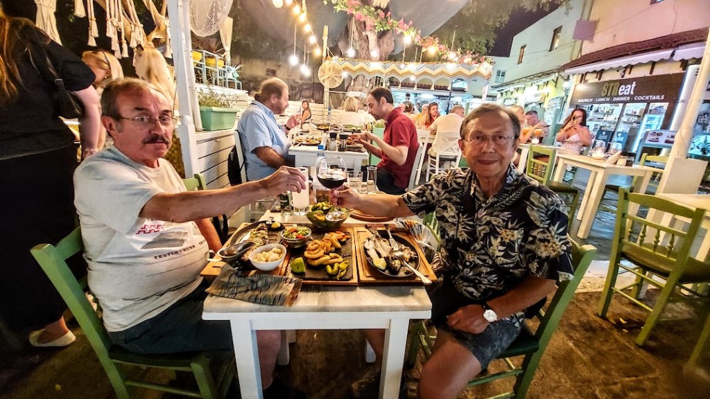 Üzerinde bulunduğum Apellou Sokağı Sokratous ile kesişmeden önce ulaşılan yer Evdimou Meydanı, devamı Platonos Sokağı. Akşam yemeklerini Evdimou meydanındaki farklı lokantalarda yedik. Genelde Midilli, Sakız ve Sisam tecrübelerimden dolayı balık ve şarap tercih ettim. Ben, ada balıkçılarının yakaladığı balıklar sanırken, Rodos’ta Güllük’ün Kıyıkışlacık Köyündeki çiftliklerde, Yunan şirketleri tarafından üretilen balıklar sunuluyormuş.