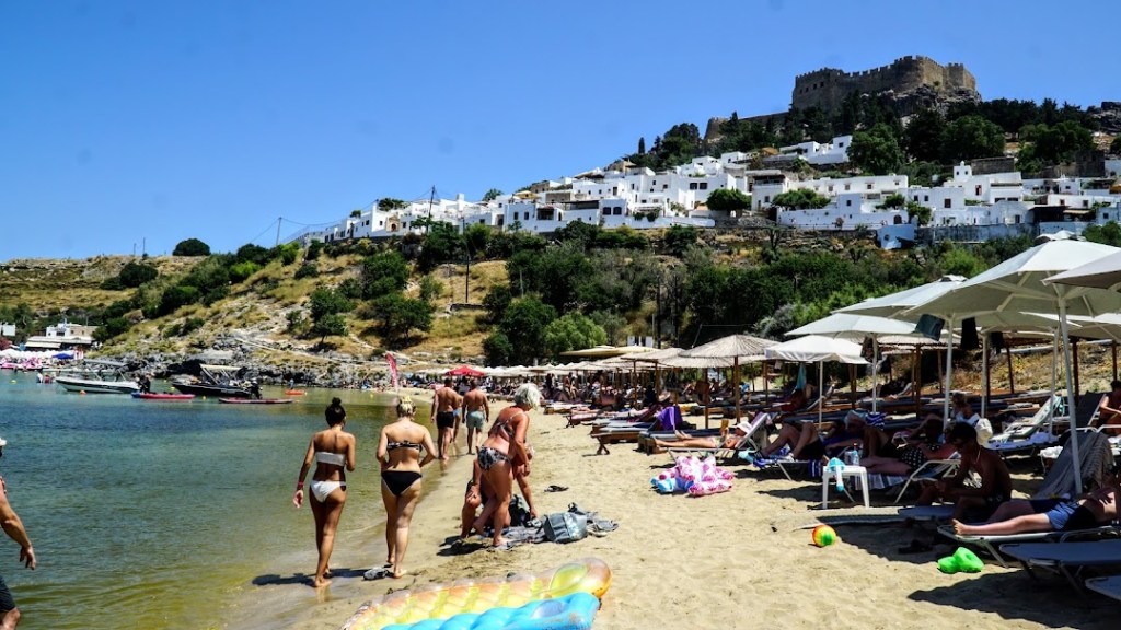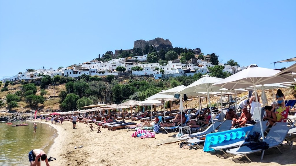 Gezinin ikinci günü, kiraladığım araçla Rodos kentinin 48 km. güneyinde bulunan, mitolojik öyküde de yer alan Lindos kentine gittik. Amacım, geçmişten izleri yakalayabilmekti. Ancak, gittiğimizde Kalenin uzağında bulunan otoparklarda yer olmadığını görünce, Kaleyi uzaktan fotoğrafladım. Kalenin hemen altındaki Lindos plajında park yeri buldum ve günü denize girmekle değerlendirdik.