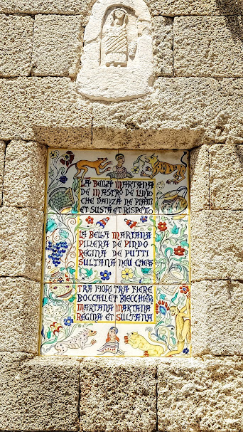 Ippoton sokağının başlangıcında sağ köşedeki bina, İtalyan seramik firması ICARO’ya aitmiş. Adada seramikçiliği geliştirmek amacıyla getirtilen Avusturyalı seramikçi Egon Huber 1928 yılında burada çalışmaya başlamış. Egon Huber’in altı parçadan oluşan seramiği duvara gömülmüş. İnsan, hayvan, bitki dalları, sürahi, kupa, çiçek ve üzüm salkımı ile çerçevelenmiş üç cümlelik fantezi bir metin. ”Düzgün Usta’nın tabaklarında dans eden, koruyan, saygılı Güzel Martana’sı/Güzel Martana, boyalı sütun, Meleklerin kraliçesi, Sultan, yeni sandık/ Çiçekler arasında, vahşi hayvanlar arasında, kupalar ve sürahiler, Martana Martana, Kraliçe ve Sultan”. Muhtemelen, çerçevelenmiş figürleri metin haline getirmiş. Buradaki Martana, Yunan Mitolojisinde Bereket tanrıçası Demeter’e karşılık gelen, Roman halklarındaki insanüstü Mart Ana karakterimidir?, bilinmez. Ama, başındaki bandanası ve kulağındaki küpelerle ben böyle bir benzetme yaptım. Rodos gezimdeki hoş bir detay.