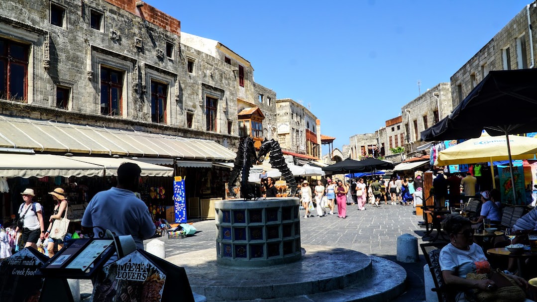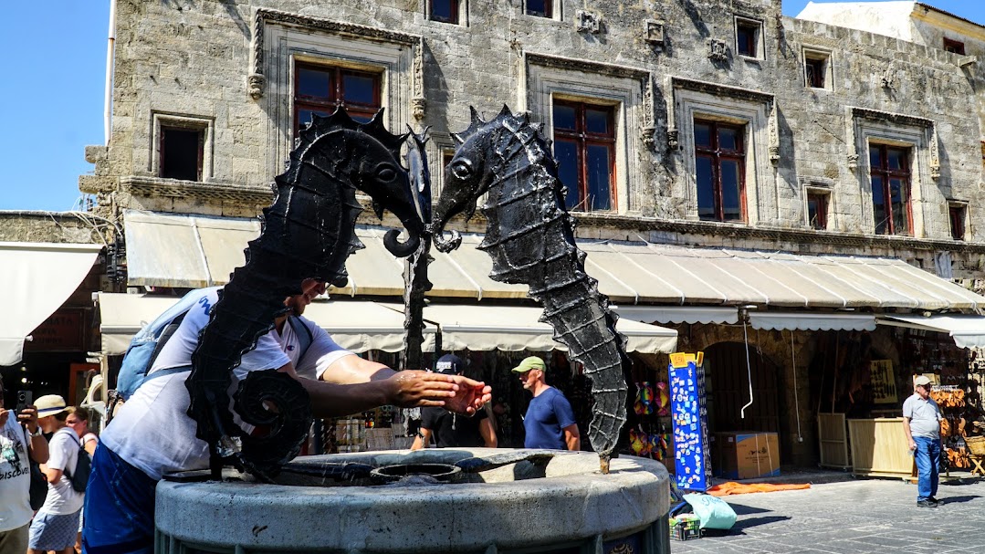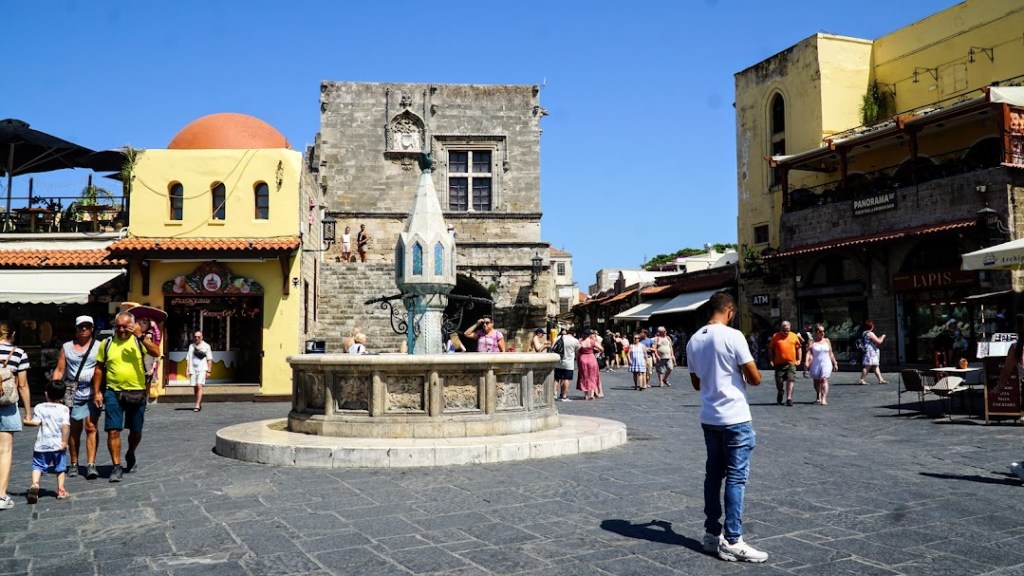 Bu aks üzerinde Osmanlı dönemi eserleri olarak Süleyman Camii ile birlikte, Kütüphane, Mehmet Ağa Camii, Türk Kahvehanesi, Şadırvan (Sintrivani) Camii, çeşmeler bulunuyor. Rodos Kenti içinde Osmanlı döneminden kalan eserleri ayrı bir yazının konusu olarak ele alacağım. Tekrar Sokratous aksına dönecek olursak, bu aks üzerinde iki meydan düzenlemesi yapılmış. Birinci meydan Ippokratous Meydanı. Meydanın ortasında altıgen gövdesi ağaç, kuşlar ve yıldızlar işlenmiş seramikle kaplı sebil üzerine dört adet ferforje, balık kafalı ağızlarından su akan lüleler yerleştirilmiş. Sebilin sivri külahının üstüne de Tanrıça Athena’nın ve bilgeliğin sembolü olan baykuş oturtulmuş.