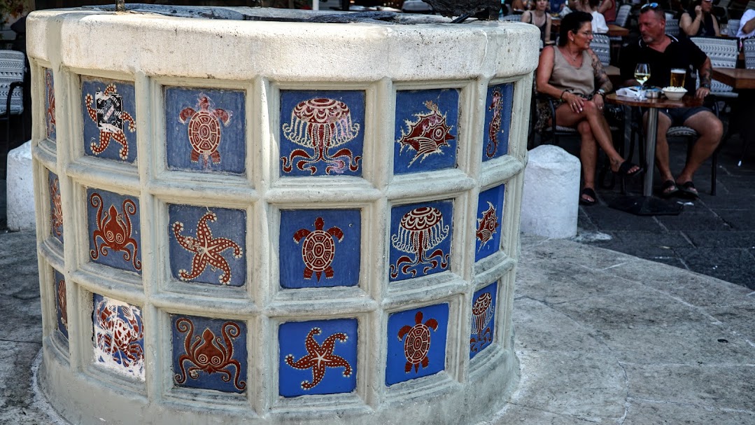 Sokağı ortasında dairesel havuzun üzerinde ferforje, üç deniz atından oluşan çeşmesi var. Havuzun gövdesine de kareler halinde, stilize edilmiş, deniz kaplumbağası, deniz yıldızı, deniz anası gibi canlıların seramikleri yerleştirilmiş.