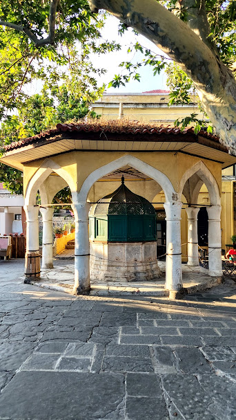 Rodos eski kentine Elefhteras (zafer) kapısından girdim ve kentin ana omurgasını teşkil eden Doğu- Batı yönünde uzanan Sokratus sokağına ulaştım. Sağa, yani batı yönüne döndüm ve hafif bir yokuş bölümü olan bu sokağın sol tarafında Mehmet Ağa Camii ile karşılaştım. Eski kentin içindeki ve çevresindeki bütün camiler ibadete kapalı. Bu nedenle camide olduğu gibi diğer camilerin de içine giremedim. Mimarisi klasik camilerden biraz farklı, Mehmet Ağa Camiinin. Kare planlı. Kubbe yerine beşik çatıyla örtülmüş. Cami kemerli bir arkadın üzerinde yükseliyor. Altında dükkânlar var. Cami katına dışarıdan demir korkuluklu bir merdivenle çıkılıyor. Kırmızı renkli duvarlara sahip. Dikdörtgen şeklindeki pencerelerin üzerine sivri kemerli ikinci pencereler yerleştirilmiş. Ahşaptan, çokgen ve kapalı şerefeye sahip, kısa bir minaresi var. Görünümü, Arap mimarisini andırıyor. 1856 yılındaki depremde ve II. Dünya savaşında zarar görmüş. 2004 yılında restore edilmiş. Caminin önünde ve sokak üstünde, mermerden yapılmış cephesi, gömülü sütunlarla üç bölüme ayrılmış, her bir bölüm üç sivri kemerle süslenmiş ve bu alanların üzerinde sarı renkli pirinçten üç filike (musluk) bulunan bir çeşme yer alıyor. Sağ filike hariç, diğer ikisi çalışmıyor. Çeşmenin bütününü kapsayan, dar ve uzun bir yalak da çeşmenin bir parçası. Bu çeşme, namaz kılmak için gelenlerin abdest aldığı yer olduğu kadar, sokaktan geçenlerin de su içtiği bir yer.