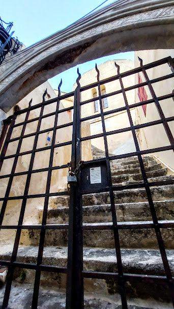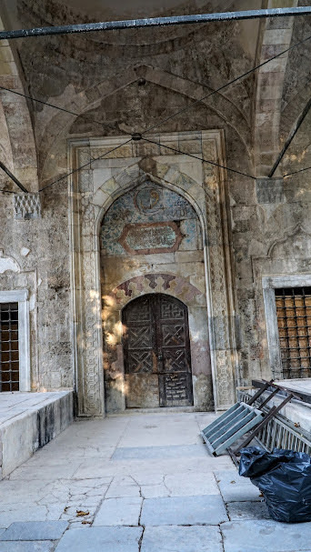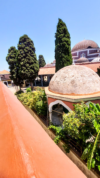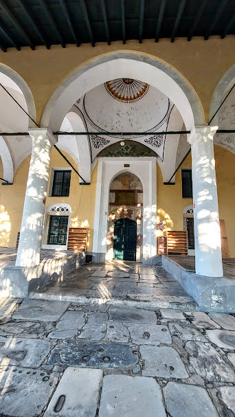 Sokratus sokağı üzerindeki, anlattığım çeşmenin yanında kırmızı kubbeli Şadırvan (Sintrivani) Camii yer alıyor. Binalar arasında sıkışmış bu küçük yapıya, arka sokaktaki kemerli ve demir kafesli bir kapıdan dar bir merdivenle çıkılıyor.