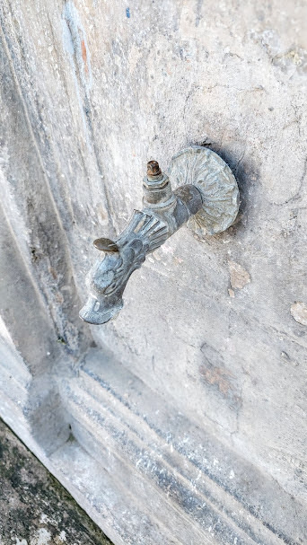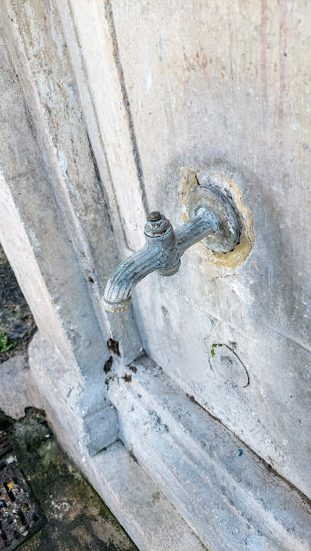 Caminin deniz tarafında yine Osmanlı mimarisini andıran (muhtemelen değişikliğe uğratılmış) binanın cephesinde mermerden, filikesi bir sivri kemerli nişin içine yerleştirilmiş ve nişin üstündeki kitabesi ile bir çeşme bulunuyor. Figüratif yıldız çiçeğinin göbeğine yerleştirilmiş olan filikenin yeri, şimdi boş. Çeşmenin mermerden yalağının üzerine de üç adet yan yana figüratif yıldız çiçeği motifi işlenmiş.