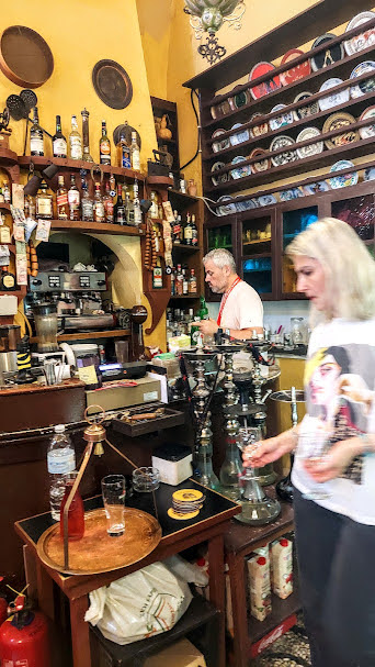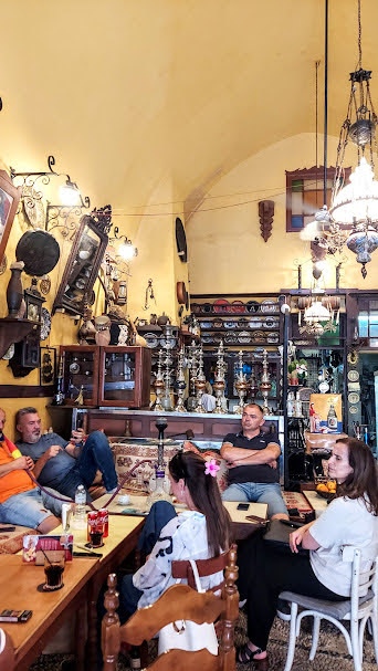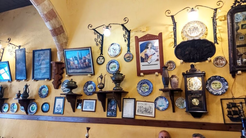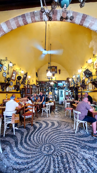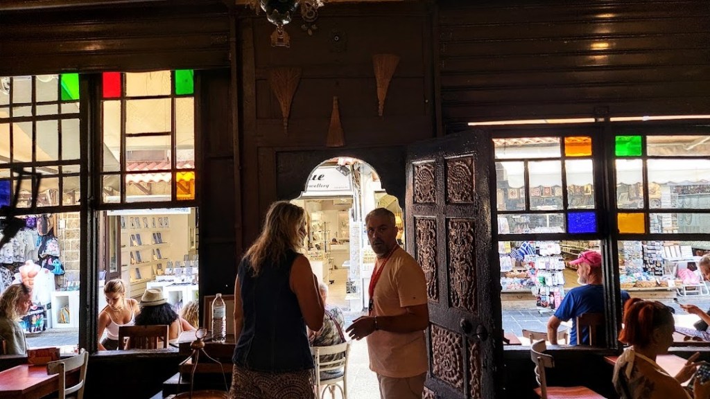 Yukarıda anlatmaya çalıştığım Türk (Osmanlı) eserlerinden başka, Sokratus sokağı no.76 da Mevlâna Türk Kahvehanesi bulunuyor. Giriş kapısının üzerindeki tabelada Mevlâna yazısının solunda ve sağında Turkish Cafe ve Shisha Bar ibareleri bulunuyor. Shisha, bildiğimiz şişe ve burada nargile anlamında kullanılıyor. 14. yüzyıldan beri açık olan Mevlâna Kahvehanesini son iki yüz yıldır aynı aile işletiyormuş. Şimdiki işleticisi Iraklis Bey. Silindirik tavana sahip dikdörtgen şeklindeki kahvenin sol arka köşesi kahve ocağı olarak düzenlenmiş. Ahşap masa ve sandalyeler duvar kenarlarına sıralanmış. Sol duvarın bir bölümüne ot yastıklı bir peyke yerleştirilmiş. Sağ tarafta DIAMANT marka kahve değirmeni sergileniyor. Duvarlarda bulunan küçük tereklerde bakır ve pirinç ibrikler, semaverler, nargileler ve bunların arasında porselen tabaklar, Rodos kentinin eski fotoğrafları sergileniyor. Ortama uygun bir gramofon da sergilenenler arasında. Çay askısı da unutulmamış, servisi bununla yapıyorlar. Kahve, çay ve nargilenin yanı sıra ev yapımı tatlılar da sunuluyor. Giriş kapısının sağında dört adet ahşap giyotin pencerelerden gün ışığı içeriye giriyor. Her bir pencere kanadı üzerine mavi, sarı, kırmızı ve yeşil küçük camlar yerleştirilerek hareketlilik sağlanmış.