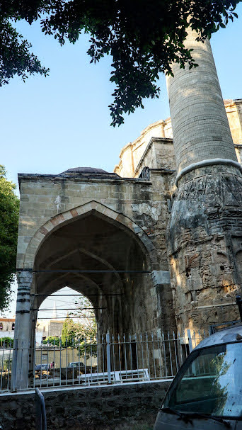 Sokratus sokağından güneye doğru biraz dolambaçlı olan Menekleous sokağı, Mustafa Paşa Camii ile sonlanıyor. Mustafa Paşa Camii olarak adlandırılan bu cami, Padişah Sultan III. Mustafa tarafından 1765 yılında yaptırılmış. Dikdörtgen planlı olan caminin dışı sarı renkli. Caminin minaresi 1973 yılında yıkılmış, sadece kürsü de denilen kaidesi kalmış. Cami bir kubbeyle örtülü. Diğer camiler gibi kapalı olduğundan içine girilemiyor. 2010 yılında onarım geçiren cami, dışarıdan son derece bakımsız görünüyor. Önündeki Arionos meydanında, mermerden yapılı sekizgen bir şadırvanı bulunuyor. Şadırvanın üstü açık. Havuz bölümünün ortasında bulunan mermer kaide, suyun geldiği fıskiyenin ayağı. Havuz gövdesinin her bir yüzünde pirinç lülelerin yerleştiği izler görülüyor. Bir tanesi yerinde duruyor. Her bir yüzde vazo ve çiçek demetlerinde oluşan süslemelerle birlikte lülelerin sağına ve soluna selvi ağaçları işlenmiş. Havuzu çepeçevre saran kanal, havuzdan gelen suyun tahliyesini sağlıyor. Ancak, meydanda susuz bir şekilde, bir anıt gibi duruyor.