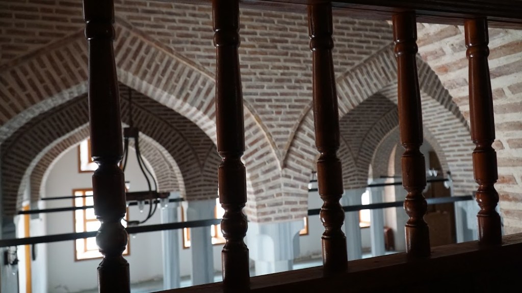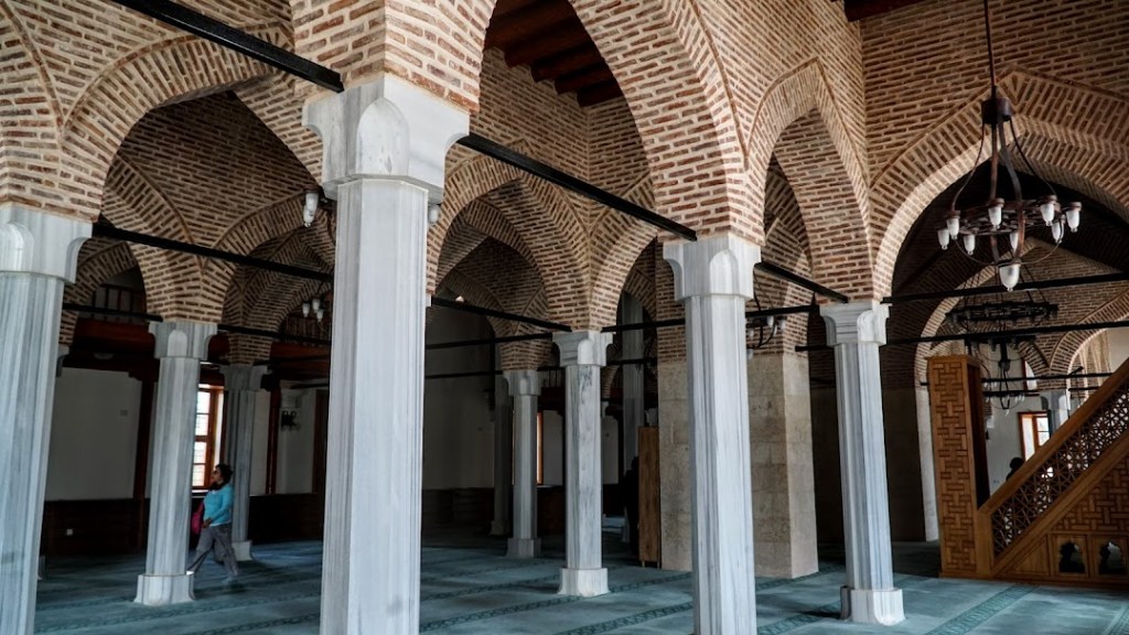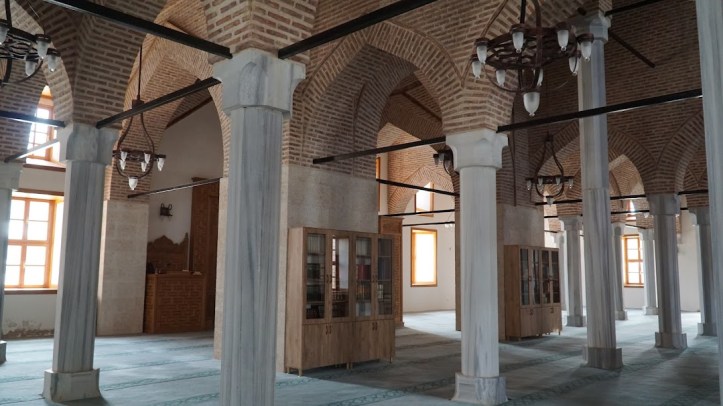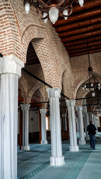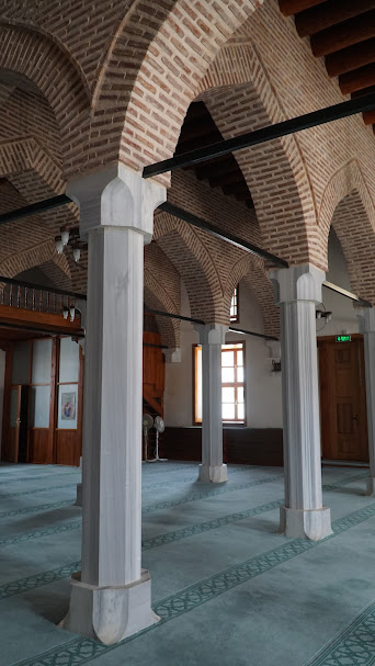 Camiye doğu, batı ve kuzey cephelerindeki kapılardan giriliyor. Batı cephesindeki kapının sağında sütun şeklinde bir sadaka taşı bulunuyor. Caminin çatısı; çinko ile kaplı olup, sütunları birbirine bağlayan, tuğladan örülmüş kemerler üzerine yerleştirilmiş. Sütunlar da, statiğin güçlendirilmesi için, birbirleriyle demir çubuklarla bağlanmışlar. İçeri girdiğimde, bu sütunların çokluğu nedeniyle, İspanya’nın Cordoba kentinde Endülüs döneminde yapılmış Kurtuba Camiine benzettim. Tabii ki, Kurtuba Camii çok büyük ve sütun sayısı çok daha fazla. Dört sıra halinde bulunan 32 sütun (her bir sırada 8 sütun bulunmaktadır), cami içini beş sahına (ya da harim) bölmüş.