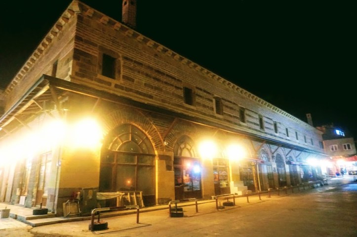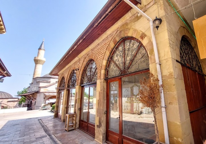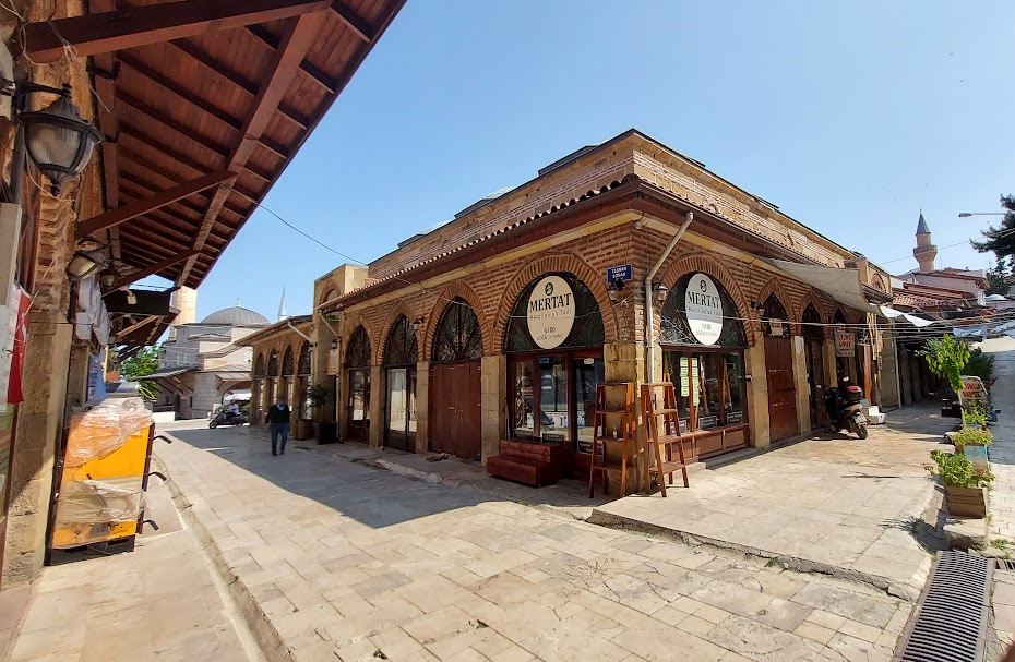 Dört dış cephesine simetrik olarak, her bir cephesinde sekiz olmak üzere toplam 32 adet dükkân ilave edilmiş. Dükkânların çatısı tonozla örtülü olup eyvan şeklindedir. Tonozların üstü, kiremit örtülü çatıyla kaplanmış.
